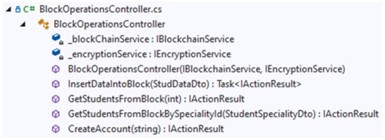 The methods of the Blockchain category are designed to connect to the blockchain database and make a transaction on behalf of the university using its account from the off-chain storage and the blockchain address (Figure 6).