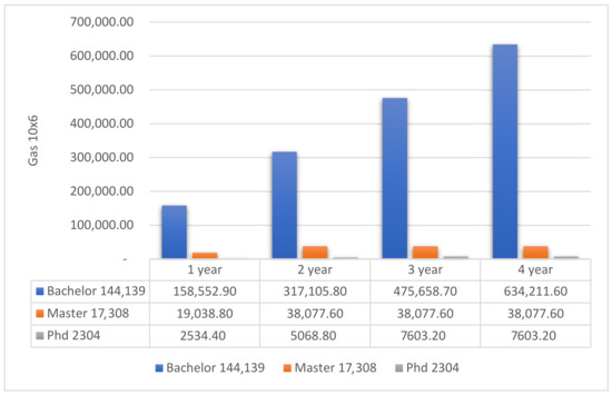 Our experiment shows that, for the execution of 1000 transactions, the blockchain consumes an average of 550,000 gas per transaction. Taking into account the number of semesters, the following expenses are incurred for each stage of study: bachelor’s degree, 4.4 million gas; master’s degree, 2.2 million gas; and doctoral degree, 3.3 million gas. Each semester, the platform processes a total transaction volume equal to the total number of university students.
