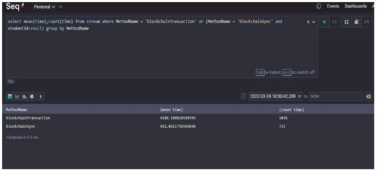 The evaluation of the criteria for the functioning of the blockchain system shows that the speed of transaction execution in our solution allows us to quickly and efficiently identify a student and to transfer data on the student’s academic performance. Moreover, the amount of information is small due to the translation of data into the JSON format and the use of an additional database.
