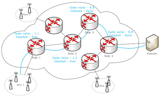 Algorithm 3 shows the specific method, after the content is obtained from the data source, hop_count, popularity and time_stamp fields will be initialized. If the current cache value is higher than the threshold, nodes will cache on the return path. As shown in Figure 4, if the threshold is set to 1, then Nodes 1 and Node 2 with cache values higher than 1 on the return path are selected as cache points.