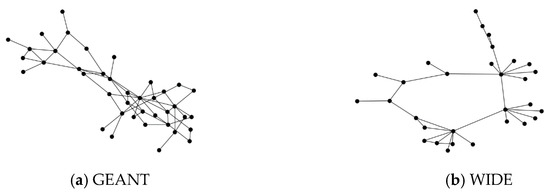 In our experimental scenario, in order to verify the scalability of PSBC in different network topologies, we chose the following real network topologies: GEANT (European Academic Network) and WIDE (Japanese Academic Network). The topology is shown in Figure 5.