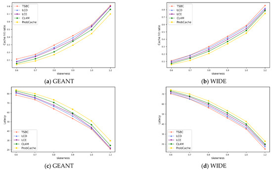 We change the to observe the impact of the two network topologies on cache hit ratio and average latency. In this part of the experiment, the user movement rate is set to 400 in the high liquidity period. The results are shown in Figure 6. Greater skewness means that users have more requests for popular content. In both network topologies, ProbCache evaluates the remaining cache space and caches content request and return paths based on probability. In high liquidity period, users requesting content have the feature of frequent movement, which results in poor performance. CL4M triggers only once, so the contents of the cache are cached first at the node with the largest centrality, which not only results in uneven replica storage, but also in greater latency and lower hit rates. LCD and LCE show similar performance. In low liquidity period, users no longer switch 5G base stations frequently. Because LCD has the feature of keeping content as close to the edge of the network as possible, it should have a better advantage for users who are also on the edge of the network. However, in high liquidity period, active users will move to different base stations in a short period of time, and the latency of LCD will be affected. Our PSBC scheme clearly performs best. The results show that with the increasing of content, hits and latencies in all scenarios have been improved, but PSBC has maintained its lead: The average access latency of TSBC is lower than that of the other four cache strategies, and the hit ratio is higher than that of the other four cache strategies. This is because in dealing with the cross-transformation between high and low liquidity, we consider the movement rates of different users and divide the user traffic into periods. The diversity and richness of cache contents are given priority in the high liquidity period, which increases the content categories within the network and reduces the delay of content requests to the external network. Users need the popularity and freshness of content during low liquidity period, therefore the calculation of the cache value using the aforementioned parameters might increase the hit rate.
