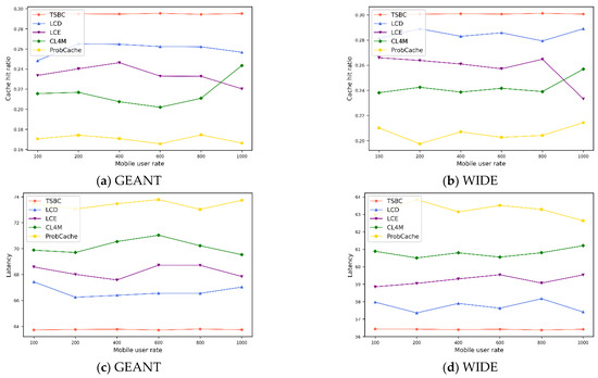 We changed the user movement rate during the high liquidity period to see the impact of the two network topologies on cache hit rates and latencies. In this part, is 0.8. The result is shown in Figure 7. In both network topologies, we can see the poor performance of ProbCache, which has the lowest hit rate and the highest latency. ProbCache, CL4M, LCE, and LCD, fluctuate significantly in scenarios that change the speed of user movement. Especially for LCE, when the rate of movement reaches 1000 in high liquidity period, the hit ratio decreases significantly in both topologies. Therefore, in the 5G-ICN BN scenario, these four scenarios are unstable for mobile caching. On the one hand, TSBC has an advantage in performance. On the other hand, when the user movement rate increases and the frequency of users accessing the network through the base station increases, the TSBC still maintains a stable hit rate and delay. To sum up, our scheme is more adaptable to changes in user traffic. The idea of piecewise caching can be used to explain this: We are able to maintain steady network performance exactly because we use various strategies at various points in time.