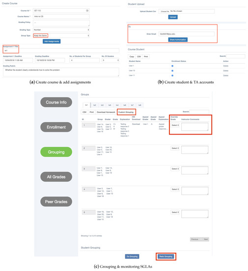 Instructors are responsible for three basic requirements when creating a course with SmartGroup: (1) using the “Course Info” tab to create the course (Figure 1a) by providing high-level grading policies (course name and section, grading system choice, assignment grade weight towards final grades, etc.) and assignment information (due dates, assessment deadlines, number of students per group, number of assessors per assignment, SGLA description and rubric, etc.); (2) using the “Enrollment” tab to create student accounts (Figure 1b) by uploading a student enrollment .CSV file from the institution’s learning management system (LMS); (3) using the“Grouping” tab to randomly group students for assignments (Figure 1c). The “All grades” tab allows an instructor to export all available grades for group assignments, and the “Peer Grades” tab allows the instructor to view all available peer assessor evaluation grades. These basic factors are necessary for normal lesson plans during course design, so the only significant source of added burden from using this system is transcription. With all of these components are taken care of, the system will create and manage SGLAs and send the instructor a set of grades upon completion. The instructor user interface for managing these steps and for viewing grades can be seen in Figure 1.