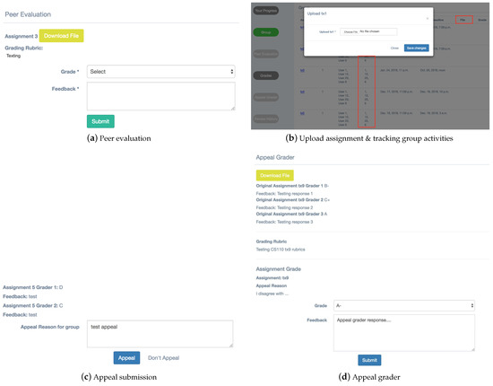 The student user interface is designed with a layout similar to the instructor user interface (Figure 2). Students do not need to sign up for an account in the system, as accounts should be created by the instructor (i.e., see Section 3.1). To sign in, the system will thus recognize that a student’s account and password are both initially the school account from the .CSV file (i.e., in this case the school-affiliated email address); a password can be changed at any time by the student after his or her initial login. Once logged into their accounts, students are able to see the following series of tabs on the left side of their screens: (1) Your Progress, (2) Group, (3) Peer Evaluation, (4) Grades, (5) Appeal Grader, and (6) Review History. Note that tabs are only active when they have material that students need to take care of, thus negating their need to constantly check every tab. The “Group” tab (Figure 2b) allows students to upload assignments, find group members and their contact information, see deadlines, find assignment grades and peer feedback. Once an assignment has been uploaded, the system chooses a selected number of peer assessors based upon instructor input and allows chosen peer assessors to access the “Peer Evaluation” tab (Figure 2a) to assess the assignment. Students can view a grade for a given assignment by clicking on the “Grades” tab; on the same page, they can also request an appeal by simply putting their arguments into the text box below their grades and comments and clicking the “Appeal” button (Figure 2c). Once an appeal has been requested, the system automatically notifies and sends a consent request to all team members. When consent for appeal is unanimous, the system then assigns an appeal assessor to perform an assessment (Figure 2d); at this point, the “Appeal Grader” tab becomes accessible to the chosen appeal grader. Students can access their previous review history and how their previous peer evaluation is evaluated by the system through the “Review History” tab.