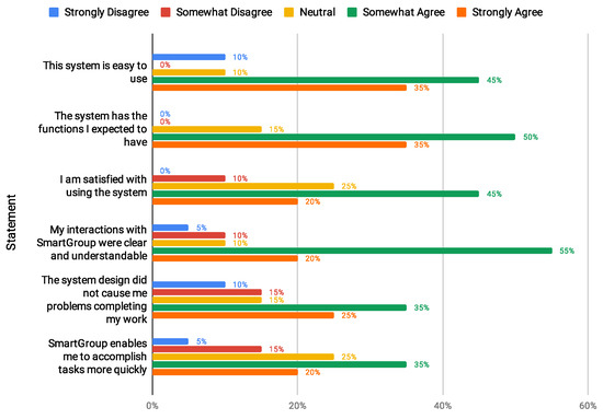 Post-Study Survey. All participants received a link to our anonymous Qualtrics survey. Survey response rates were acceptable (i.e., 47.6%, n = 20). The survey contained 15 questions, and could be finished in 10–15 min. It included 3 clusters of 4–6 Likert-type scale statements about system clarity and ease of use [68], user system satisfaction [69] (see Figure 4), evaluation of functionalities, etc., and 9 open-ended questions which covered themes such as whether there were any problems using the system, avenues for potential improvement, what participants liked and disliked about the system, if participants felt like SmartGroup improved peer assessments, which aspects of the system were most beneficial, and 3 demographic questions (i.e., age, gender, and intended major).