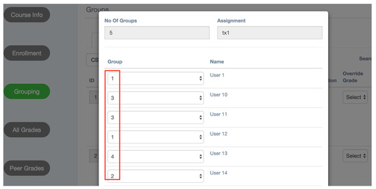 Semi-automated grouping. Note that the values in the group column are system defaults from random grouping. Repeated values indicate students share a group. Instructors can manually switch students by changing their group number.