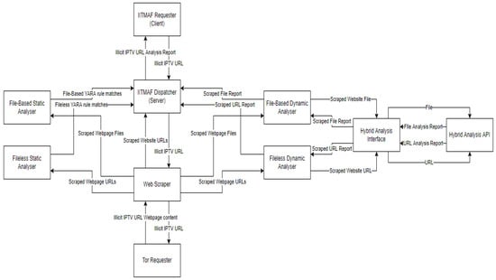 The IITMAF consists of several components working together to support the investigations for the IPTV ecosystem. A web scraper was designed and implemented for the collection of malicious scripts and files. A Tor requester was implemented in the scraper so that the anonymity of the investigator was ensured. For the collected artefacts, both file-based and fileless static analysers were included in the framework since, as explained previously, malicious actions and objectives are sometimes provided within a shellcode/script format. In
