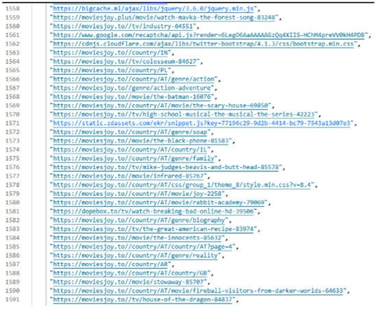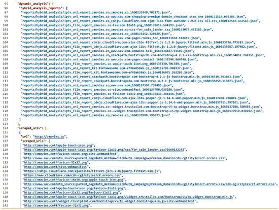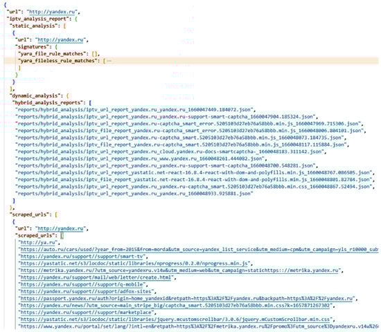 https://www.virustotal.com/gui/domain/static.zdassets.com/relations (accessed on 25 August 2023)). Moreover, another URL to an external domain, bigcache.ml, had a URL path pointing to an alleged JQuery library JavaScript file. The VirusTotal report of this URL reported two malicious and one suspicious antivirus alert in addition to classifying the domain as a malware site. This implies that the iterative URL collection function is effective at collecting URLs from a website including any external domains that could be used for malvertising. Hence, the IITMAF is capable of iteratively scraping potentially malicious URLs from a website.