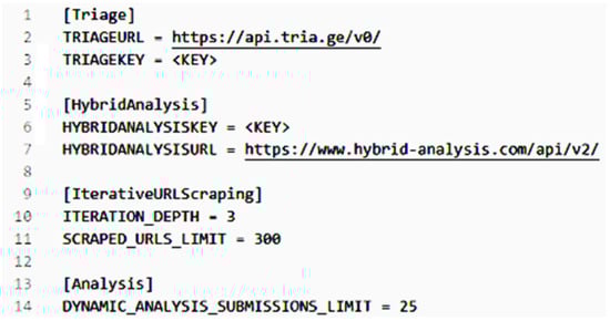 Before submitting the URL of zmovies.co to the dataset and running the IITMAF software solution, we made some modifications to the solution configuration file. The configuration file enables the user to set limits to the collection and analysis to shorten the duration of a dataset’s analysis or to increase the volume of information reported. We set the scraper depth to 3, the maximum number of URLs scraped to 300, and the dynamic analysis submission limit to 25, as shown in