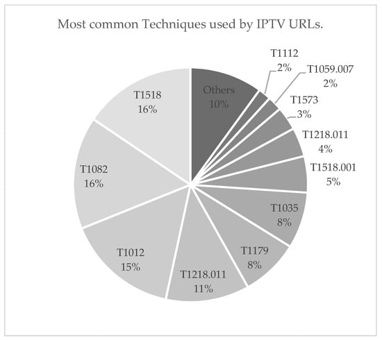33]. Therefore, within our experiment, we have also collected the Techniques, Tactics, and Procedures of the MITRE ATT and CK framework and presented below the most common techniques that have been utilised on these IPTV sources: