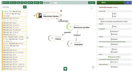 One of the end-user applications powered by GraphBRAIN is SKATEBOARD, which was purposely developed to support semantic-based, interactive, and dynamic browsing of the KG. It provides various filters for the information to be displayed, tools for expanding the portion of the graph under consideration and looking into the single graph components for their information content, and additional facilities, such as maps, that allow easy location-based analysis and browsing of the data.