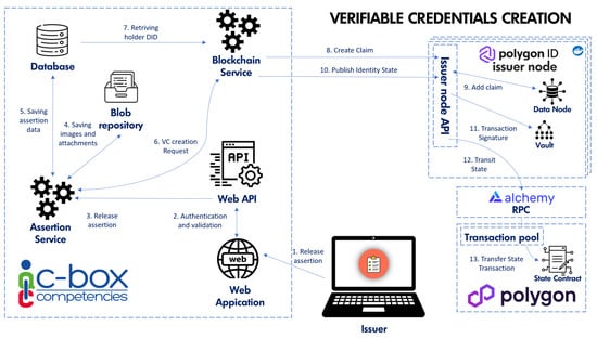 Finally, the status of the latter is evaluated (11) and compared with the status published on the blockchain (12–13), thus validating the integrity of the issuer node.