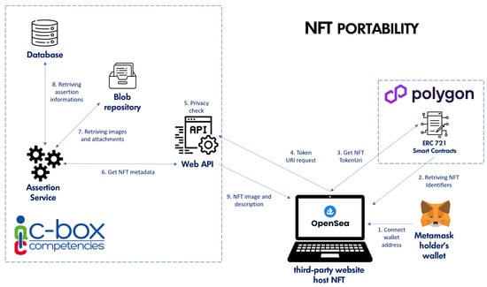 https://opensea.io/, accessed on 23 October 2023), for instance—can now query the smart contract and retrieve the URL to access specific metadata (description of the NFT, any attributes, and the image), as depicted in