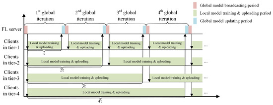 In each global iteration, clients from different tiers upload their local models, and the FL server can estimate when a client may upload its local model according to its associated tier. Figure 2 provides one example to illustrate the scheduling of the clients from four tiers in LESSON. For example, the clients in Tier 1 are expected to upload their local models in each global iteration, and the clients in Tier 2 are expected to upload their local models in every two global iterations. Denote k as the index of the global iterations, and let be the binary variable to indicate whether the clients in Tier j are expected to upload their local models by the end of global iteration, where