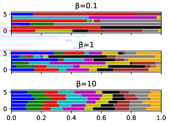 where M is the total number of label classes (i.e., for both CIFAR-10 and MNIST), is the gamma function (), and is the concentration parameter that determines the level of label imbalance. A larger results in a more balanced data partition among different labels within a client (i.e., much closer to IID) and vice versa. Figure 4 shows how different labels of images are distributed by varying . In addition, we assume each client would train its CNN model over data samples locally based on stochastic gradient descent (SGD) with base learning rate [39] and epoch equal to 1.