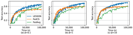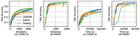 Assume that and s. Figure 5 shows the test accuracy of the three algorithms over the global iterations and simulation time for CIFAR-10 and MNIST. From Figure 5a,b, we can find that LESSON and FedAvg have similar test accuracy, i.e., ∼70% for CIFAR-10 and ∼95% for MNIST. However, the test accuracy achieved by FedCS is lower than LESSON and FedAvg, i.e., ∼60% for CIFAR-10 and ∼90% for MNIST. This is because FedCS only selects fast clients to participate in the training process, and so the derived global model can only fit the data samples for fast clients, not slow clients, thus reducing the model accuracy. Meanwhile, the convergence rate with respect to the number of global iterations for LESSON and FedAvg is also very similar, which is slightly faster than FedCS. However, by evaluating the convergence rate with respect to the time, as shown in Figure 5c,d, we find out that LESSON is faster than FedAvg. For example, the global model in LESSON has already converged at 20,000 s for MNIST, but the global model in FedAvg is still under-trained. This is because the FL server in FedAvg must wait until the local models from all the clients have been received in each global iteration, and thus, the latency of a global iteration incurred by FedAvg is much higher than that incurred by LESSON. Table 2 shows the average delay of a global iteration incurred by different algorithms, where the average latency of a global iteration incurred by LESSON is 48 s faster than FedAvg. As a result, FedAvg only runs around 588 global iterations at 20,000 s in Figure 5d, respectively, but LESSON runs 2000 global iterations.