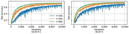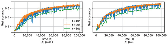 Test accuracy over the time for CIFAR-10, where (a) , (b) , and (c) .