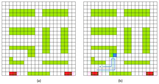 (a) A 20 × 20 modern warehouse environment where white cells indicate accessible areas for UGVs inside the warehouse and green cells indicate the shelves. Red cells indicate the two exits (and delivery areas) of the warehouse. During operation, robots navigate to pick up the product and bring it to one of the exits. (b) depicts a blue robot (blue dot) navigating its way to pick up a product (blue cell) and then bring it to the closest exit.