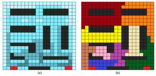 (a) Visualizes the traffic of each cell within the warehouse. Darker shades of blue indicate higher traffic. Red cells indicate the exits of the warehouse, and black cells indicate the shelves. In (b), we can visualize the generated sub-areas using the proposed AP-based algorithm. Each color besides red (which is used to denote the exits) and black (which is used to denote the shelves) denotes a separate sub-area (cluster). Areas with more traffic are more likely to yield smaller clusters.