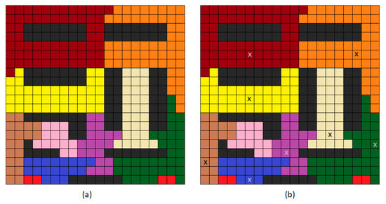 (a) Visualizes the generated sub-areas using the proposed AP-based algorithm. (b) Visualizes the selection of battery placement within each of the generated clusters using the scoring formula (Equation (2)). Cells used for battery placement are marked using “x” notation.