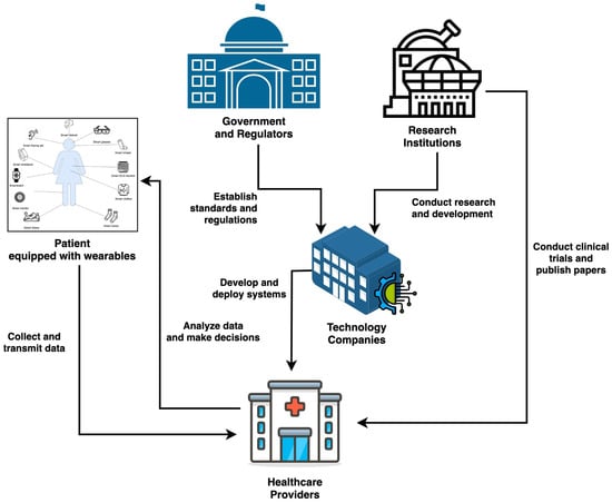 An Edge AI-based early health prediction system, such as the one depicted in Figure 3, involves several key stakeholders, including patients, healthcare providers, technology companies, governments and regulators, and research institutions. Each of these stakeholders plays an indispensable role in developing and implementing Edge AI-enabled systems tailored to early health prediction. Working together can help ensure the systems’ efficiency, safety, and ethical behavior, with significant benefits for patients and healthcare providers. Patients are the primary users of Edge AI systems for early health prediction and are responsible for collecting and transmitting data to healthcare providers. Healthcare providers are tasked with reviewing the data collected from their patients and using the information to make informed judgments about patient care. This includes the processes of diagnosing diseases, developing appropriate treatment plans, and monitoring patient well-being over time. The task of developing and implementing Edge AI systems for healthcare is being undertaken by technology enterprises. This includes the development of sensors, devices, and AI algorithms in conjunction with the execution of edge computing and cloud infrastructure. Governmental and regulatory entities assume a central role in formulating benchmarks and guidelines for the use of Edge AI in healthcare. This includes ensuring compliance with privacy and security laws and protecting patients from potential harm. Finally, Research Institutions play a key role in advancing the field of Edge AI and developing new technologies for early health prediction. This includes participating in research and development projects, conducting clinical trials, and disseminating research findings through scientific publications.
