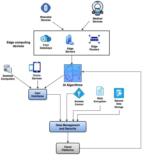 Artificial intelligence has become a fascinating discipline within computer science, concerned with the careful development of algorithms and systems designed to mimic the cognitive abilities of human intelligence. Its overarching goal is to develop machines that are capable of learning, reasoning, and making data-driven decisions, similar to the cognitive abilities of humans. AI is playing a central role in healthcare, unleashing its potential across a broad spectrum that includes disease diagnosis, treatment modalities, personalized medicine, and continuous monitoring of patients’ well-being. On the other hand, edge computing is a distributed computing architecture that brings computing power closer to the data source [5,6,22]. In today’s dynamic landscape, edge computing has emerged as a timely and common-sense solution to meet the increasing need for fast data processing and rapid decision making in a variety of domains. Edge computing is relevant in various fields, such as the IoT, industrial automation, and the ever-evolving healthcare industry. Unlike the traditional cloud computing model, which relies predominantly on centralized data centers, edge computing involves the strategic deployment of compact and efficient computing devices at the periphery of the network, right where the data originate. There are notable benefits to be gained from this approach, such as increased processing speed and reduced latency, as data no longer need to be transferred to a central location. In healthcare, edge computing is useful in wearable devices for patient monitoring, remote diagnosis, and treatment. In addition, this approach is a valuable privacy and security enhancement because it allows sensitive information to be processed locally. By reducing reliance on the transmission of such data to a central location, the risks associated with long-distance data transmission are mitigated, and the protection and confidentiality of critical information are strengthened. Edge computing is an example of an innovative paradigm that optimizes the handling of data in real time and empowers various sectors, especially healthcare, with its transformative potential. Figure 1 shows the architecture of edge computing for healthcare.