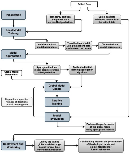 By implementing federated learning, healthcare providers can effectively train models on patient data that come from many different sources. This approach allows for a more comprehensive and diverse set of data from which the model can learn, leading to greater accuracy in predicting and detecting diseases in their early stages. In preliminary health diagnosis, the implementation of federated learning is an effective mechanism to develop predictive models that can predict the likelihood of diseases such as cancer, diabetes, and heart disease [72,73,74]. By thoroughly analyzing data collected from different patients, the model can efficiently identify patterns and risk factors that would be difficult to detect in a single patient. In addition, federated learning can help address privacy issues in healthcare. The risk of data breaches is significantly reduced because patients’ data are stored on their devices rather than sent to a central server, which increases patient privacy [72,75].