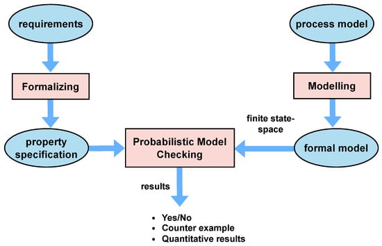 Probabilistic model checking has risen to prominence in this context, providing a means to verify systems that incorporate probabilistic behaviours, with probabilistic models being intended to quantitatively assess system performance and precision [18]. In recent times, probabilistic model checking has established itself as a powerful method for verifying both hardware and software. This technique is recognised for its broad applications, notably in the assessment of reliability, dependability, and performance [19,20]. A noteworthy collaboration was achieved by combining probabilistic model checking and process mining. This was implemented using discrete- and continuous-time Markov chain models, as detailed in [21,22]. The authors proposed a framework to verify whether a discovered model satisfies certain desired properties or constraints and provided answers to questions of how likely, how long, and what factors influence possible paths in a process. Figure 1 illustrates the probabilistic model-checking method for process-mining models.