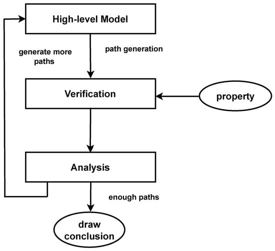 The conceptual roots of SMC are linked to pioneering work by [32], who initially proposed this technique to explore the properties of probabilistic systems. Their approach integrates Monte Carlo simulation [33] methods, a class of computational algorithms that rely on repeated random sampling to obtain numerical results, and statistical hypothesis testing. In practice, SMC leverages the power of statistical methods, particularly Monte Carlo simulations, to approximate the likelihood that a stochastic system satisfies a particular property. It achieves this by conducting multiple random simulations of the system in question and then applying statistical analysis to estimate the probability that a given property holds. Figure 4 illustrates the general workflow of SMC. As shown in Figure 4, the high-level model is the model of a complex and/or partially uncontrollable system on which we wish to perform SMC. The model generates sample paths, and the number of properties can be utilised to perform verification. As the verification results are statistical in nature, it is required to get an idea of reliable results by running an optimal number of steps, and the analysis stage is responsible for this process by checking the number of paths and drawing a conclusion. If the number of paths is sufficient to accept the results, then the process ends with drawing a conclusion; otherwise, additional paths are generated from the defined model.