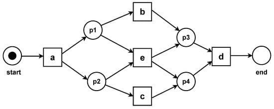 Process discovery algorithm: Let I denote the set of process discovery algorithms. In a formal sense, a process discovery algorithm can be defined as a function that maps an event log to a process model. Specifically, for each , we have , where L represents the set of event logs and represents the resulting process model. The primary objective is to ensure that the discovered process model accurately reflects the observed behaviour within the event log. Figure 6 shows a model of log L discovered using a simple discovery algorithm, Alpha Miner. Alpha Miner, one of the first and simplest process discovery algorithms, is utilised for its capability to discover a process model that is easier to understand compared with other discovery algorithms, which may generate complex models.