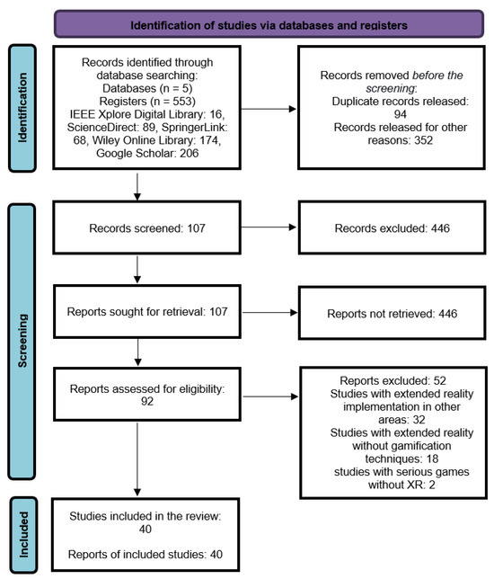 At the conclusion of the search process, 553 relevant results were found. The results were as follows: 16 from IEEE Xplore Digital Library, 89 from ScienceDirect (Elsevier), 68 from SpringerLink, 174 from Wiley Online Library, and 206 from Google Scholar. Following the removing of duplicates and articles unrelated to the research, we relied on 107 works for the first analysis. After screening these records based on their title and abstract, we performed a full-text reading of 92 works, which were then assessed for eligibility based on a full-text reading analysis. We excluded 52 of these works since they did not pass the eligibility assessment per our established set of exclusion criteria, which are listed as follows: