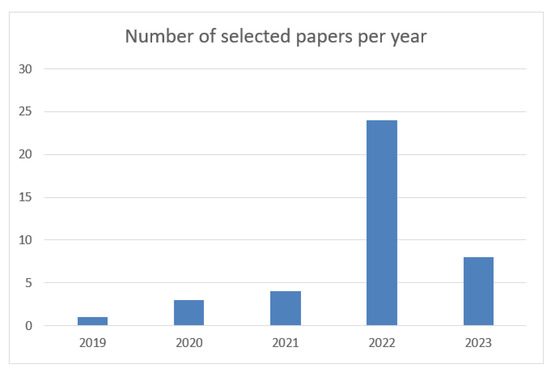 We downloaded the entire file of each of the 40 works collected for the review to ensure a proper analysis. We considered papers published between 2019 and 2023, with an upward trend in publishing. We found that most of the records (n = 24) were published in 2022 (see Figure 2). Figure 2 presents the distribution by year of primary studies about XR. As can be observed, XR is an emerging technology. The growth in the research about XR is very important, and it is a tendency that can be observed between the years 2019 and 2023. It is also important to mention that this study encompasses early 2023.
