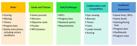 - Lameras, P.; Arnab, S.; Dunwell, I.; Stewart, C.; Clarke, S.; Petridis, P. Essential Features of Serious Games Design in Higher Education: Linking Learning Attributes to Game Mechanics. Br. J. Educ. Technol. 2017, 48, 972–994. [Google Scholar] [CrossRef]