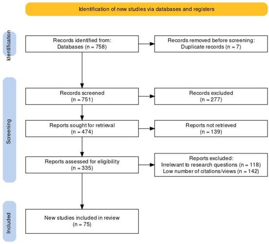 We conducted the study by identifying, screening, and determining the eligibility of research articles to be included in the review (see Figure 1). The WoS database was searched using the search keywords relevant to the research question or objectives of the study that allowed the usage of a single platform (Clarivate WoS web platform) that gives results from different publishers (IEEE, ACM, MDPI, etc.) []. We have collected the results and removed the duplicates. The remaining articles were screened in two steps. First, we have used the article’s title and abstract to check if they potentially meet the inclusion criteria, and we have excluded the irrelevant ones. The ones that pass the initial screening are then assessed based on the full text using the inclusion and exclusion criteria to determine the articles that will be included in the systematic review.