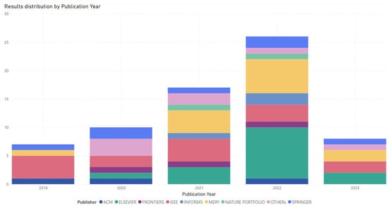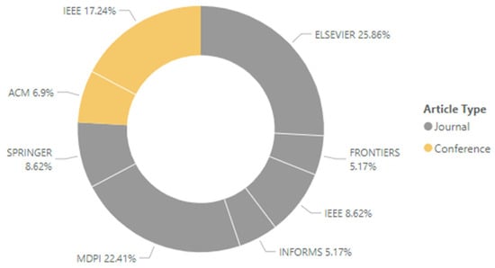 In the end, 75 articles were selected for the review. Figure 2 shows the paper distribution per publisher (e.g., IEEE, MDPI, Elsevier, Springer, etc.) as well as the ratio between journal and conference articles. Most of the articles included are journal articles.