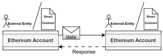 Each account has a 20-byte address derived from the public key of the account and has a state composed of storage, contract code, current Ether balance, and a nonce which is a counter that ensures each transaction is executed only once []. There are two types of accounts with the same structure and capabilities of sending messages with only small differences between them. The externally owned accounts are created by third parties that are outside of the blockchain network and have no associated code. The messages sent by this type of account are created and signed by the owner. The second type of account is associated with a smart contract and has code that is executed every time a message is received, and it also has storage that can be modified by the code. For the externally owned accounts, the contract code and storage are null. The accounts can send messages from one to another (Figure 4) in the same manner regardless of their type. The messages can contain data besides value (unlike Bitcoin transactions). If the recipient account is contract-based, it can also send a response back to the sender.