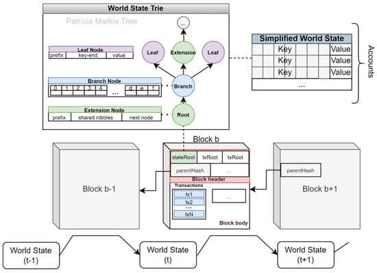 The Ethereum blocks contain the most recent state of the network, a list of the transactions included in that block, the block number, and difficulty. The state is stored in a tree component, and it is updated by changing only the part of the tree that contains the accounts that are affected by the transactions in the block (Figure 5). The state is given by the accounts, and after the transactions are executed, the state of the network changes.