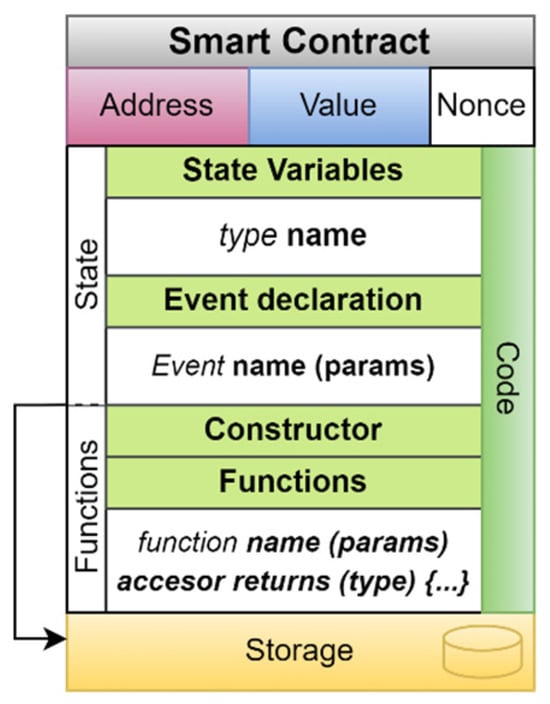 The smart contract’s structure is shown in Figure 6. Each contract has code and storage in addition to account address, value, and nonce that are also present for the externally owned accounts. The definition of a smart contract has two components. The contract state is defined by specifying the state variables and their types, and the structure of the events that can be emitted by this smart contract during code execution. The second component defines at least one constructor and the functions that can be triggered by sending messages to the contract. The constructor is called in a special type of transaction used for contract creation and it is responsible for initializing and saving the state variables in the contract storage. The functions can change the contract state by updating the state variables and creating or sending messages to other accounts. Besides the returned message, they can also emit events.