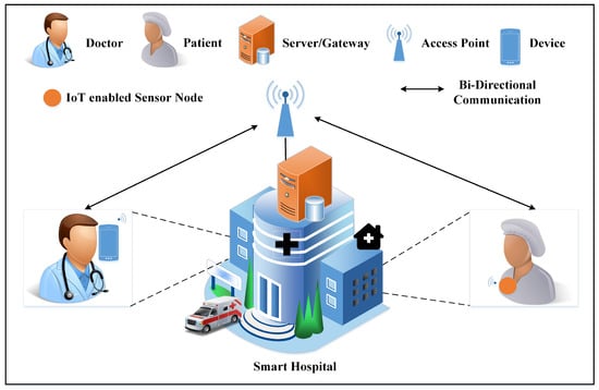 The use of 5G and the Internet of Things (IoT) have revolutionary changed and created innovation in different sectors []. IoT applications are already being deployed extensively, in various domains such as wearables, smart homes, smart cities, agriculture, industrial automation, and healthcare. The main challenges for IoT in different sectors include ensuring security and privacy, managing power consumption, developing scalable architecture, integrating with existing systems, selecting appropriate components, and testing smart devices for reliability []. Remote user verification and data privacy challenges are a top priority in IoT-based applications in different sectors []. The IoT is the backbone of the smart healthcare ecosystems []. The healthcare ecosystem is a complex network of organizations, individuals, and resources involved in delivering healthcare services []. It includes healthcare providers such as hospitals, clinics, and physicians, as well as insurance companies, government agencies, pharmaceutical companies, medical device manufacturers, and patients []. The healthcare ecosystem is constantly evolving and adapting to changes in technology, healthcare policies, and patient needs []. IoT-based smart healthcare systems have become popular in recent years. IoT-based healthcare enables the remote monitoring, real-time tracking of patient data, and improves the communication between patients and healthcare providers []. Effective healthcare ecosystems require collaboration and coordination between all the different entities such as patients, healthcare professionals, clinical devices, smart equipment, and limitless wireless sensors []. This includes sharing information, resources, and best practices to mitigate the affected person’s consequences and decrease costs []. Some common characteristics such as equity, comprehensive services, adequate workforce, information systems, and infrastructure are crucial for healthcare ecosystems []. The goal of the healthcare ecosystem is to provide accessible, high-quality care to patients while also promoting innovation and efficiency []. IoT-based healthcare has the ability to enhance the affected person’s results, lessen healthcare expenses, and improve the care quality []. However, it is essential to ensure that patient data are safe and healthcare providers have the necessary infrastructure and training to use the IoT effectively.