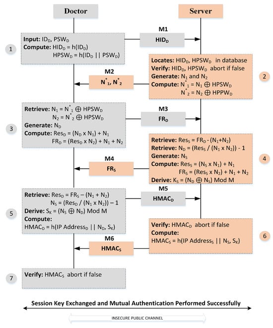 The same session key is exchanged between the remote user (doctor) and the server. The key would be used in security services such as mutual authentication, data confidentiality, and data integrity over vulnerable public networks. Figure 3 shows the complete process of session key exchange and mutual authentication among server and remote user.