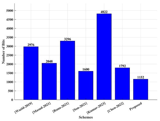The communication cost refers to the cumulative computation of various transmissions that have traversed the communication channels during the phases of key agreement and authentication, which is typically quantified in bits. For ease of communication evaluation, we defined the size of different variables such as the timestamp as 32 bits, the random number as 128 bits, the identifier as 128 bits, and the hash value as 256 bits, respectively. Our proposed approach incurs a communication cost of (128 + 256 + 128 + 128 + 256 + 256 = 1152) bits, spread across six messages. As illustrated in Figure 5, the comparative analysis of communication expenses is presented, contrasting our proposed method with alternative related strategies. The comparative assessment reveals that our suggested approach, which integrates the key exchange technique, experiences notably lower estimated communication overhead in comparison to various preexisting methodologies. Specifically, our proposed method achieves a reduction in communication costs of up to 32.55% when compared to the approach discussed in reference [].