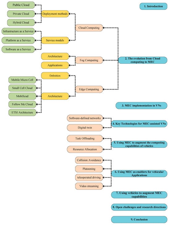A detailed review of the recent literature on MEC development is therefore required to provide insight into the state of the art of this field and aid in the discovery of future research pathways in the context of VNs. There have already been several surveys on MEC in the last few years, as illustrated in Table 1. Work [] investigated the architecture of MEC with a focus on its various applications in different network areas. It mainly presented a brief definition of the applications and architecture of MEC and did not investigate works in the context of VNs. In ref. [], authors illustrated a study on different architectures of MEC and discussed use cases and challenges in the MEC area. This work does not investigate the most recent works on MEC, i.e., those that have appeared since 2020. In survey [], researchers discussed MEC-enabled 5G use cases. They studied the architecture of MEC and potential security issues in different networks. In ref. [], authors studied mobility-aware MEC. They concentrated on the mobility aspect of IoT devices, architecture, services, and applications of things in distinct IoT networks. Work [] presented a study on MEC and VNs. Their work only covered usage scenarios, a range of services, and technologies, without delving into the latest developments. In contrast, our paper delves into recent advancements concerning the augmentation of computational resources, commonly employed applications, and the integration of vehicles to enhance MEC capabilities. We also strived to provide readers with insights into the most up-to-date algorithms and methodologies that are currently being employed in this context. In another study [], authors worked on fundamentals, services, enablers, and challenges in MEC. They studied key technologies, applications, and services in MEC-enabled IoT. Their research does not focus on a specific type of IoT network, such as VNs. The research initiatives for managing user mobility in a MEC-assisted network for distinct types of services are examined in []. That work investigated caching and computation offloading considering the mobility of diverse types of devices in MEC environments. Most of the above surveys in the MEC area discuss IoT networks in their generality, and they are not specifically focused on VNs. In ref. [], researchers have studied mobility management, handovers, communication dependability, and the effectiveness of techniques for offloading tasks in a Vehicle-to-Everything (V2X) environment. Ref. [] provides a review for computing offloading strategies in the context of MEC. The study presents a comparative evaluation of various frameworks while addressing the challenges associated with offloading in MEC. However, that study does not specifically target VNs, focusing solely on offloading approaches. Work [] provides a focused review of task allocation methods, highlighting the methods and optimization algorithms in conjunction with various network types in edge computing systems. In ref. [], a thorough examination of MIMO-MEC research is presented, delving into research scenarios, application scenarios, and evaluation indicators.