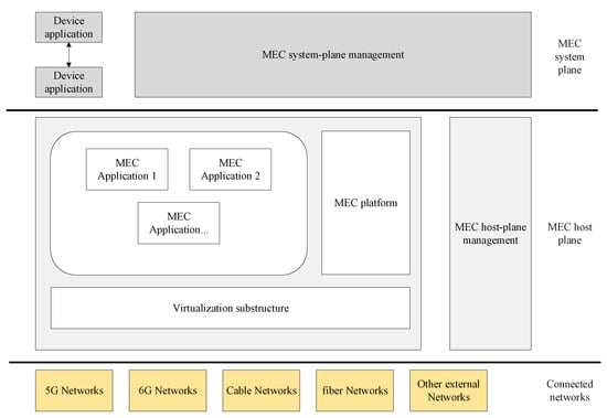 In 2014, ETSI started the standardization work for the mobile edge computing architecture, whose initial specifications were notably related to cellular networks. However, at the end of 2018, ETSI extended its focus to other networking technologies such as cable networks and non-3GPP networks such as WiMAX [] and switched the name to “multiaccess edge computing”—still having MEC as an acronym—to better highlight its access-agnostic nature. In [], a complete framework for MEC is illustrated, which includes a reference architecture that outlines the characteristics of different crucial components, connection points, and interfaces and how they are interconnected. This architecture is composed of three parts as shown in Figure 4: first, a MEC system plane, which includes device applications and a MEC orchestrator, then a middle plane known as the MEC host plane, which consists of MEC applications, the MEC platform, virtualization substructure, and their corresponding components, and finally the core and cloud network plane. MEC applications can perform various jobs, such as running a task on behalf of the user, obtaining location information, task offloading, and resource allocation, by running VMs in virtualization infrastructure. The responsibility of coordinating and interacting among MEC applications is on the MEC platform. The principal coordinator among the user side and other parts of architecture is the MEC orchestrator, which provides services such as keeping track of available resources, creating connections with the virtualization infrastructure, managing applications, etc. The UE application runs on the user-side device. Due to being near the user, MEC provides the lowest latency for real-time applications and it manages available resources and allocates them to applications in an optimal way in terms of storage and computation resources [].