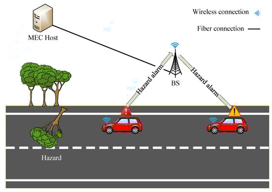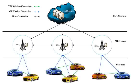 The design model of MEC in VNs is depicted in Figure 5. It consists of three different layers [], namely the user-side layer including smart cars, the MEC layer including distributed Roadside Units (RSUs) and MEC servers to provide storage and computation resources, and the core network layer which has cloud platforms and core network data servers.