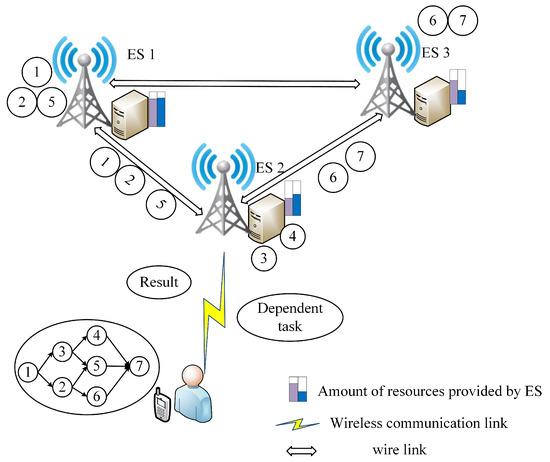 Although our study’s task offloading strategy involves completely offloading the dependent task to the ES, the time it takes for the dependent task to execute locally still serves as a baseline for comparison, thus necessitating their modeling. In terms of the task model, we emulated most of the existing literature [18,19,20,21] by modeling a dependent task as a directed acyclic graph (DAG) , where denotes the set of sub-tasks of the current dependent task. Each sub-task is represented by a binary group, i.e., , where denotes the size of the current task and denotes the size of the computation result. denotes the dependency relationship between the sub-tasks, and when depends on , can start the computation only after finishes and the result of the computation is transmitted to .