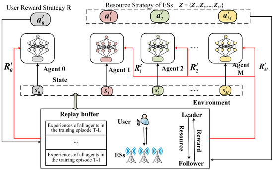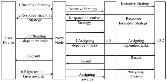 The working architecture of the system in this article is shown in Figure 2, in which the user and the ESs construct an incentive mechanism through the Stackelberg game. Within this mechanism, the user takes the role of leader and proposes an incentive strategy, which is designed to encourage the ES to participate in task computation by offering a reward. The proxy node publicizes the user’s incentive strategy, and, if the ES (follower) responds to the user’s incentive strategy, it informs the proxy node of the amount of resources it can contribute. The proxy node then informs the user of the ES’s response strategy. Next, the user offloads the dependent task to the proxy node, which, by assuming a greedy strategy, calculates that each ES needs to compute sub-tasks, where C is the number of sub-tasks in the dependent task and N is the number of ESs encouraged to participate in task computation. The proxy node iterates through the values of i to distribute resources. Following this, based on each resource allocation strategy, a task distribution plan is obtained using reinforcement learning that is based on S2S neural networks. Upon completion of the task, the proxy node returns the results to the user. If the user verifies the results as correct, the reward is given to the proxy node, which then distributes the reward according to each ES’s ratio of resource contribution. This process can be repeated if extended to a multi-user scenario.
