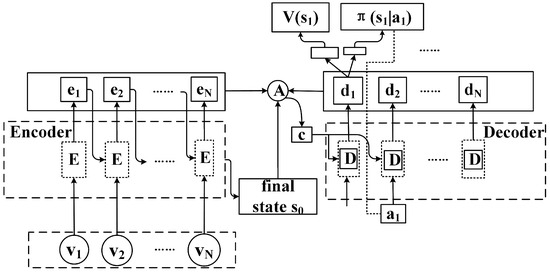where and are the concatenations of row vectors, and and are the learnable parameters. In addition, two fully connected layers are added to output of the decoder, wherein one serves as the output distribution of the action network and the other serves as the output state value of value network . When the training of the S2S neural network is completed, the output of the network is the task assignment decision to be obtained.