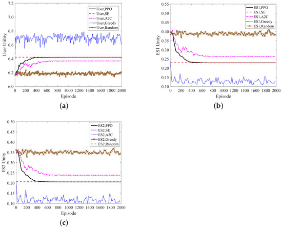 Utility convergence graph. (a) User unity convergence graph; (b) ES1 unity convergence graph; and (c) ES2 unity convergence graph.