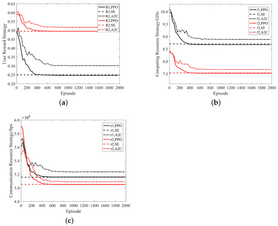 Based on the analysis in Figure 5, it can be concluded that the greedy algorithm and random method are unable to solve for the maximum social welfare (SE). Therefore, in order to enhance the readability of the result graphs, the subsequent strategy and convergence plots do not include the results of these two methods. Figure 6a–c are the convergence graphs of the user price strategy, ES computing resource strategy, and the ES communication resource strategy, respectively. For the user, their price strategy is a reward offered to incentivize ESs to participate in task computation, and this corresponds to both computing resources and communication resources. In the algorithm designed in this paper, as the number of iterations increases, the participants’ strategy gradually approaches the theoretical Nash equilibrium, which finally converges to a position that is exceedingly close to equilibrium. Although the A2C algorithm can also converge, its policy after convergence still has a certain distance from the theoretical Nash equilibrium strategy. Therefore, in terms of convergence speed or convergence accuracy, the method designed in this paper is generally superior to the traditional A2C method.